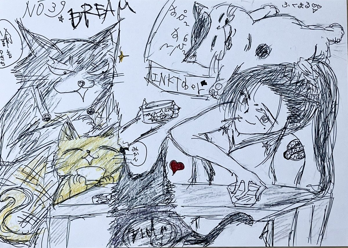 インクトーバー用アップ No.39:dream 大好きな猫との飲み会こそドリームぅ😍 ふくまるかわいい😆 諭吉ぃ、おつまみお願い🥺 みかん、いるだけでOK😌 入りきらなかったから、描けなかったけどマイケルはレジェンドだし🤔 膝上の「ハル」も大好き😃 #みかん絵日記 #デキる猫は今日も憂鬱 #おじさまと猫 pic.x.com/dbIaaecw2l
