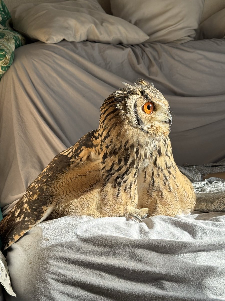 おはよう☀️まーちゃん🦉 ソファの上で日向ぼっこ☀️ あんよをお上品に重ねた お雛様スタイル🎎が珍しいね🥰 #フクロウ #ベンガルワシミミズクのまーちゃん #フクロウのいる生活 #おひなさま pic.x.com/zOyyiNrptZ