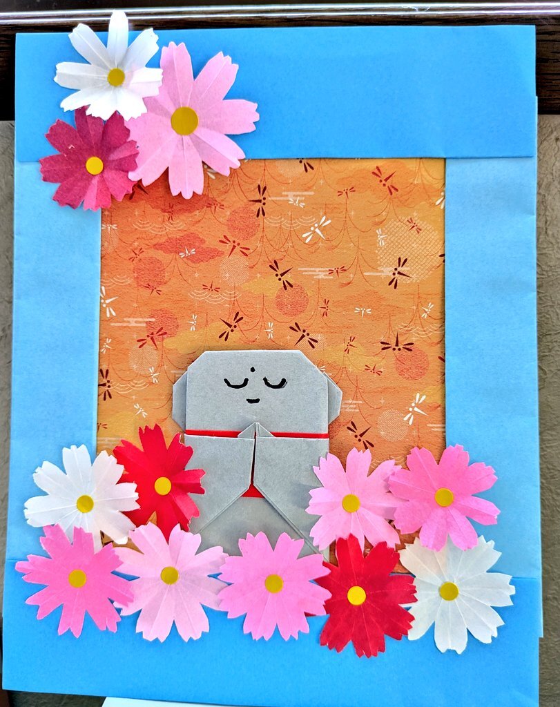 片づけしてたら、使いそびれた #トンボ柄台紙 みつけたので @KOKKO15 #辻本京子 さんの #コスモス #お地蔵さま 貼ってみました。 #おりがみ #ハンドクラフト @KowaStore トンボ柄おりがみ pic.x.com/ZGuFPXSUTH