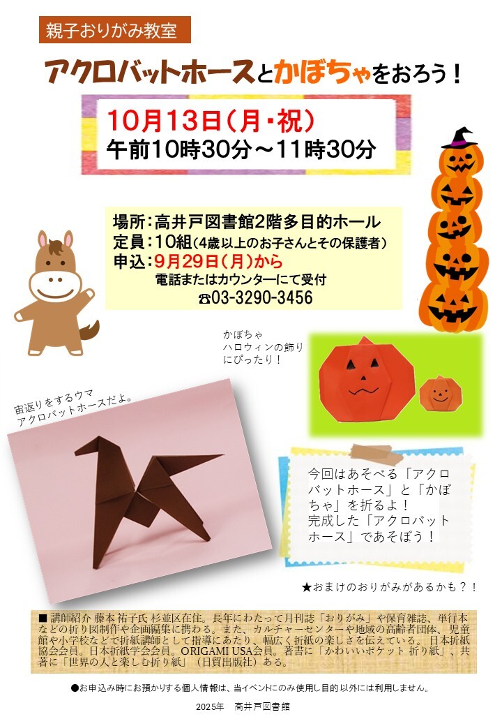 【イベントのお知らせ】 明日10月13日(月・祝)10時30分に「親子おりがみ教室 アクロバットホースとかぼちゃをおろう!」を開催します。 宙返りするウマ「アクロバットホース」と、ハロウィンのかぼちゃを折ってみませんか。 まだお申込みいただけますので、ぜひ親子でご参加ください。 #おりがみ pic.x.com/Yz5LGK96HO