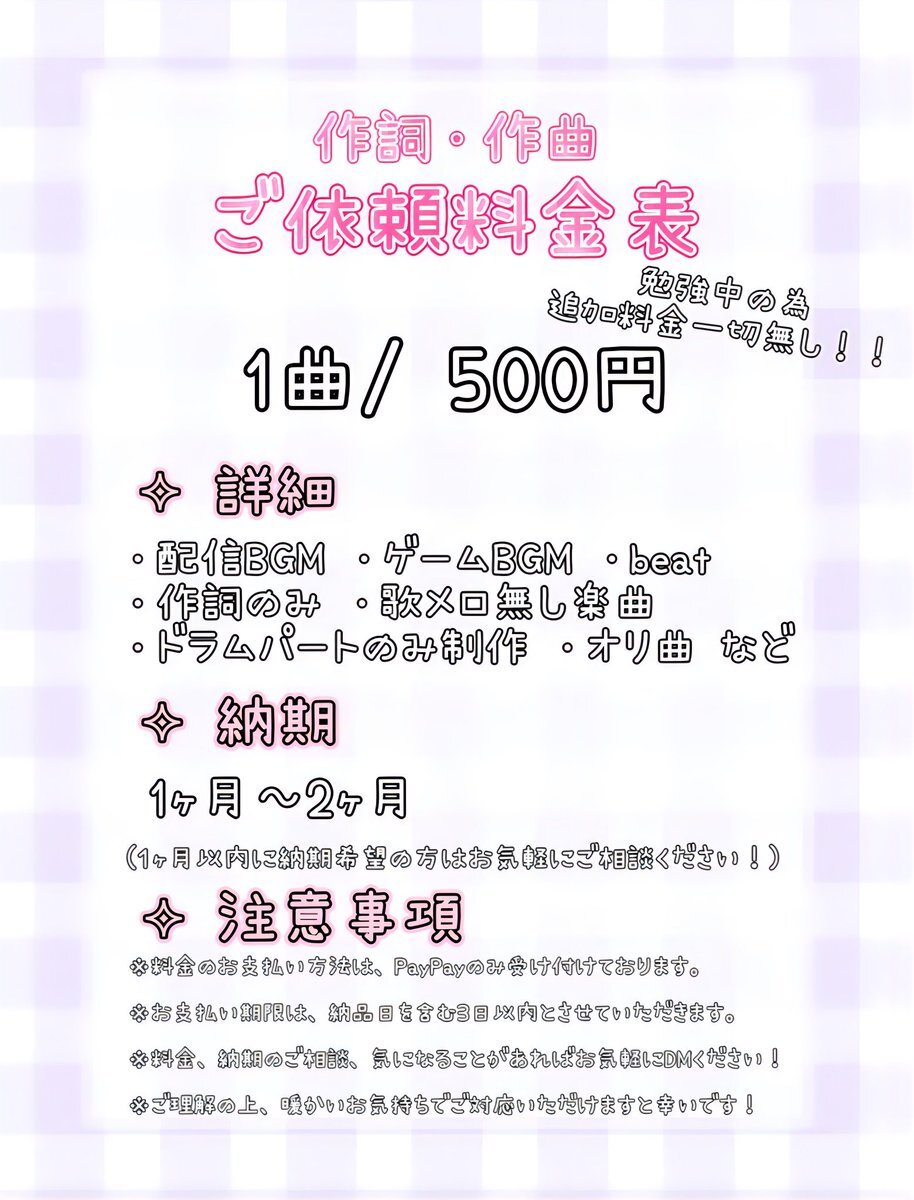 ・*·̩͙꒰ঌ《お仕事・ご依頼募集》໒꒱·̩͙*・ DMご依頼募集 開始致しました! ︎︎⟡ 1曲 ¥500︎︎ ⟡ かわいい系が得意ですが、かっこいい系も作成可能です︎✦︎ ドラマーなので、ドラムパートのみの制作も受け付けております! #お仕事募集 #依頼 #依頼募集中 #楽曲提供 #配信 #BGM pic.x.com/rvCMh4aD1S