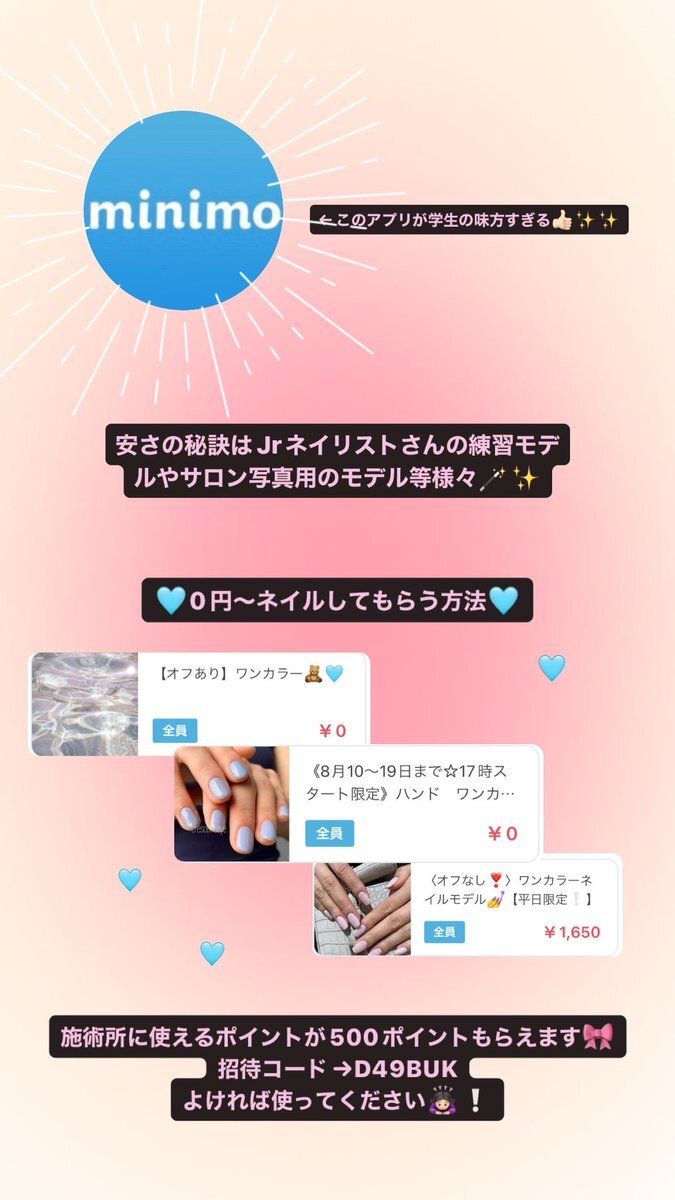 まじでみんなミニモ使って欲しい🥹! ミニモってアプリを使ったらネイルが千円でしてもらえたりします!!! 金欠学生はミニモに頼るべし💴💴‼️ 招待コード『D49BUK』です よければ使ってください🙇‍♀️ #ミニモ #minimo #招待コード #お友達紹介 #紹介コード pic.x.com/vFRempUthx