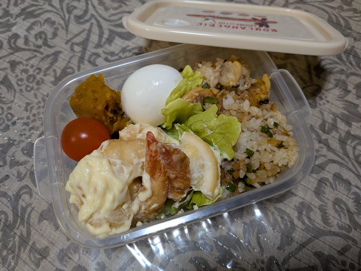 今日は アサリピラフ ゆで卵 かぼちゃの煮物 ミニトマト 海老マヨ(スーパーお惣菜) 今日は終わったら…!! なので定時で爆速で帰ります!! で、明日はお弁当作らないので今週は2個しか作らなかったな… 来週はきっちりと。 #お弁当記録 #お弁当作り楽しもう部 pic.x.com/gseKqKJ0Ti