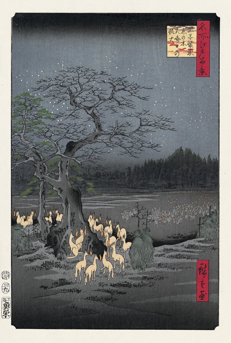 長らく在庫切れだった #広重 の「名所江戸百景 王子装束ゑの木大晦日の狐火」ですが、年末に向けて現在工房にて増刷中です。ただいま5%OFFにてご予約を承っております。大晦日 #王子 には全国の #お稲荷様 が集まったそうです。今も大晦日の夜には、地域の方々による「狐の行列」が行われています。 pic.x.com/O1BJDo7zyC