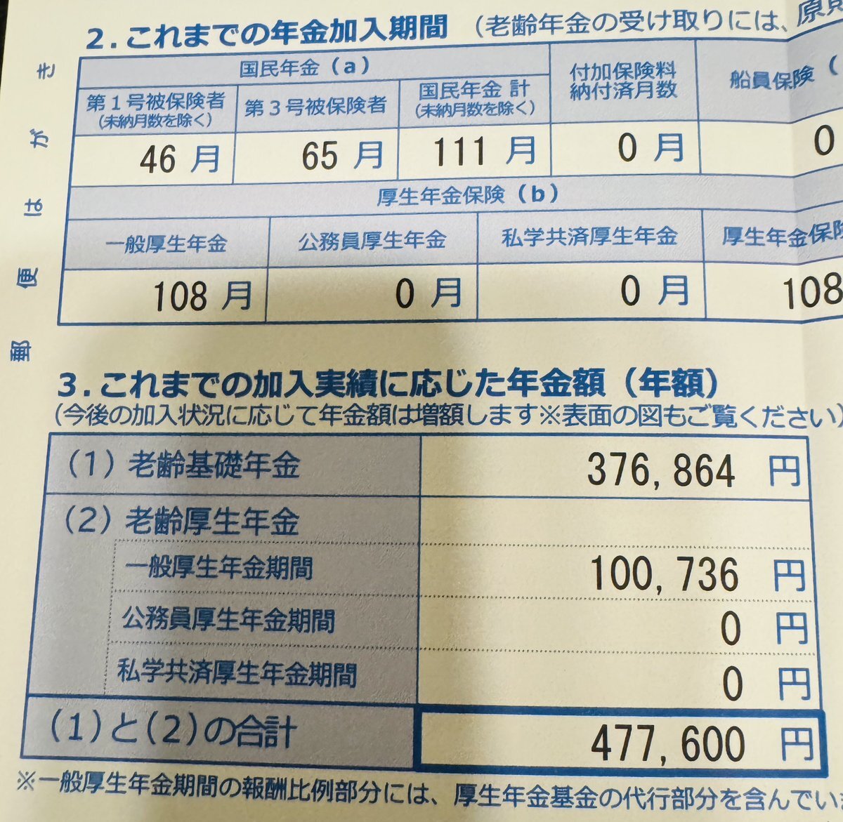 今日届いた「ねんきん定期便」 そろそろ 老後に夫婦2人で 年金含めて 年収入500万を目指す方法とか考えるか 今のままなら 夫婦合計で年280万前後 FP知識と先日のセミナーのお陰で 自力で厚生年金を増やすか 第1号被保険者で 国民年金基金で積み増すか 選択肢見えるのが楽しい #FP #お金の勉強 pic.x.com/jeHccM0ZZF