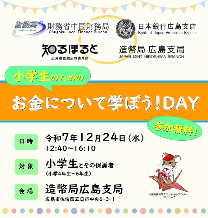 / ◆ 12月24日(水) ◆ 「小学生のためのお金について学ぼう!DAY」を開催します📣 \ 小学生が、お金のことについて楽しく学べるイベントです✍ 📍 造幣局広島支局 ✅ 参加無料! ✅ 先着40名まで 詳しくはこちら👇 lfb.mof.go.jp/chugoku/conten… #中国財務局 #お金の勉強 pic.x.com/ceYQwGNHBE