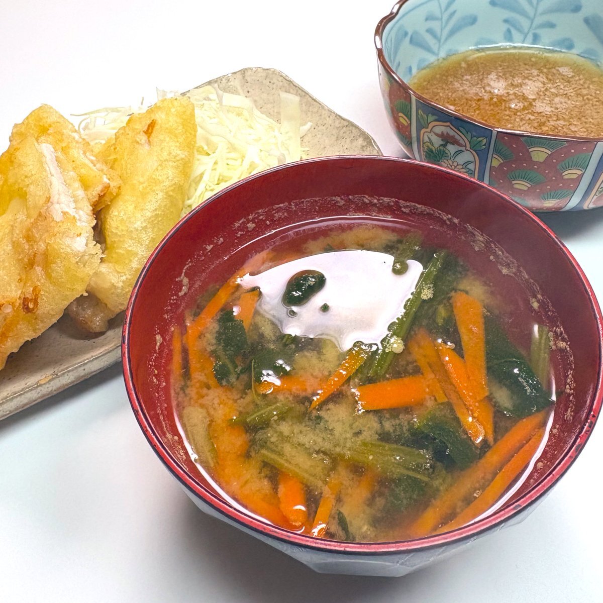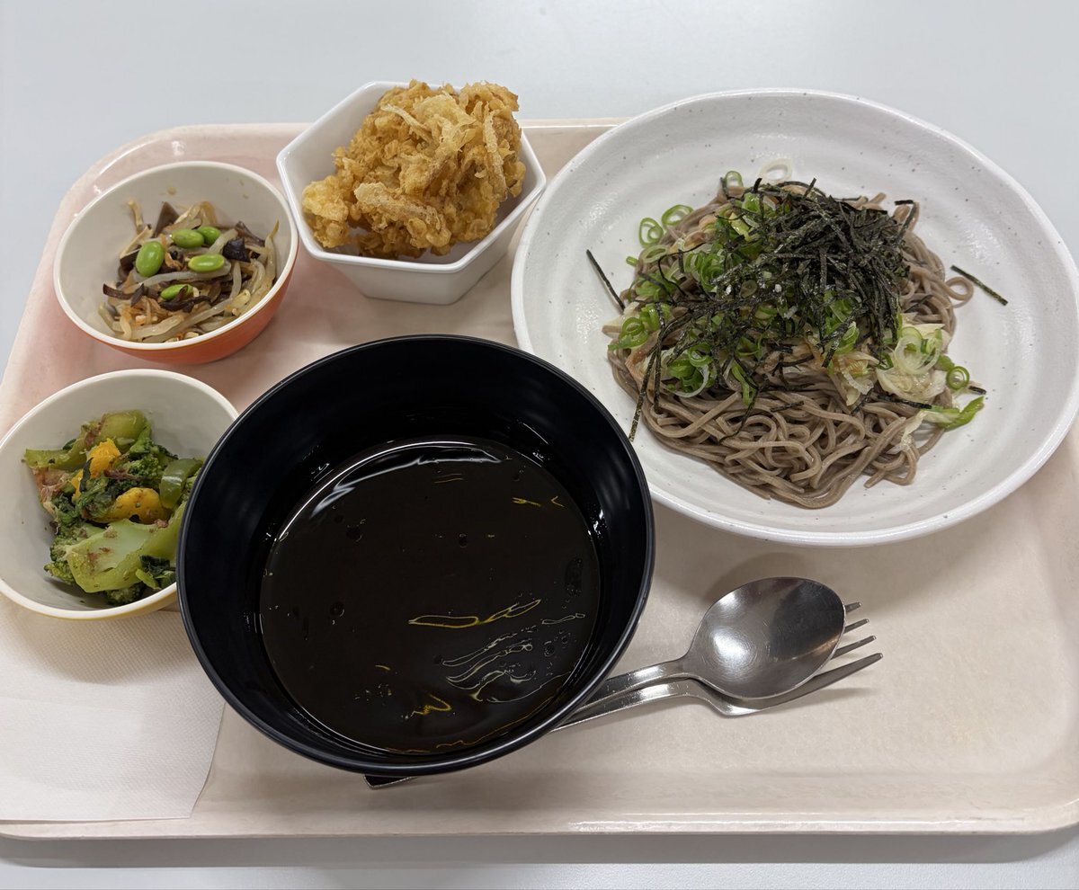 今日の #社員食堂🥰 限定70食の #ピリ辛葱つけそば #かき揚げ #干し豆腐とキクラゲの中華和え #緑黄色野菜のおかか和え 「つけそば」は、熱盛で美味しかったです👍 pic.x.com/XVAWqSG38e