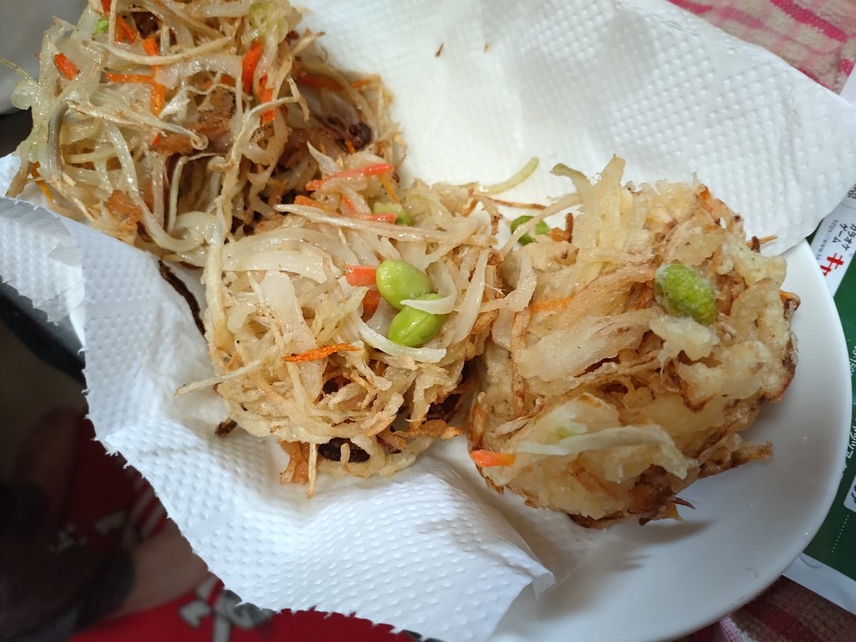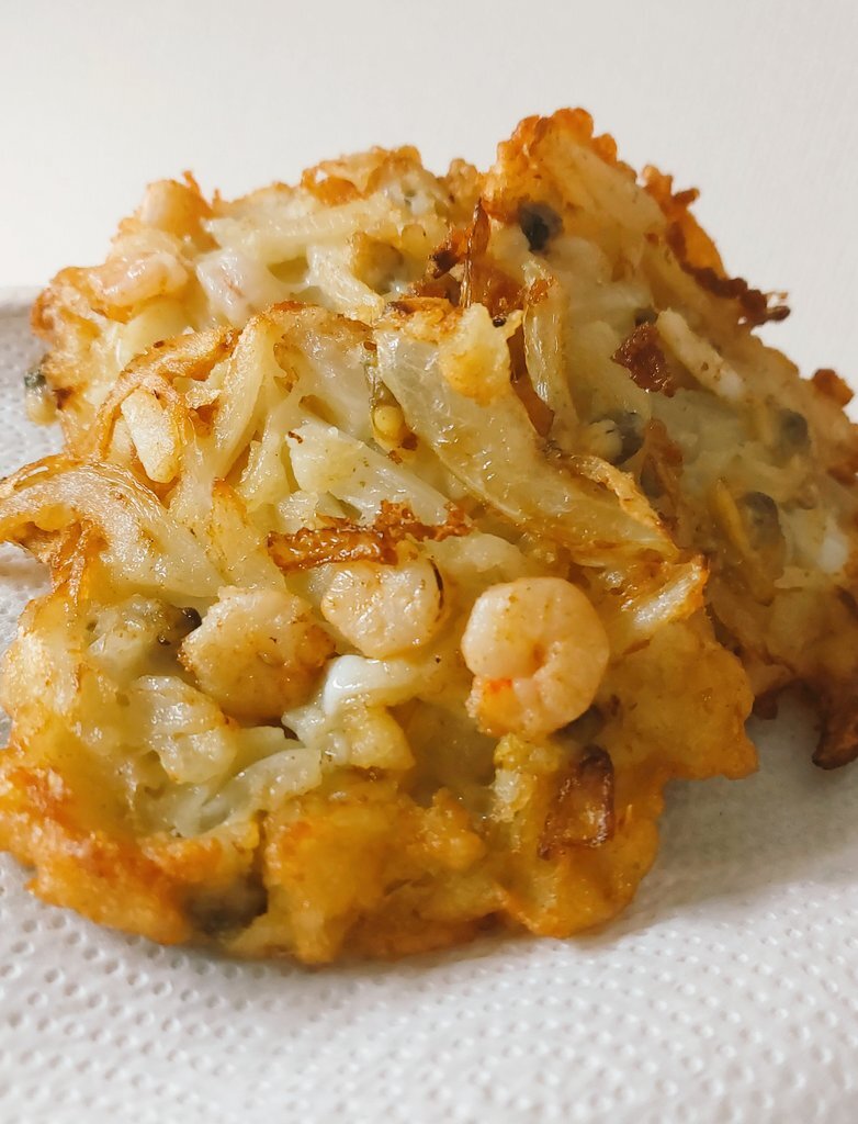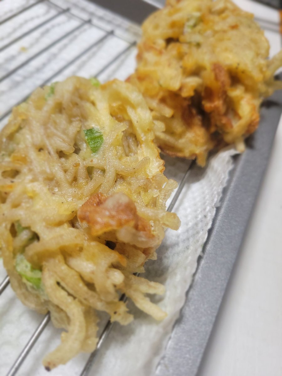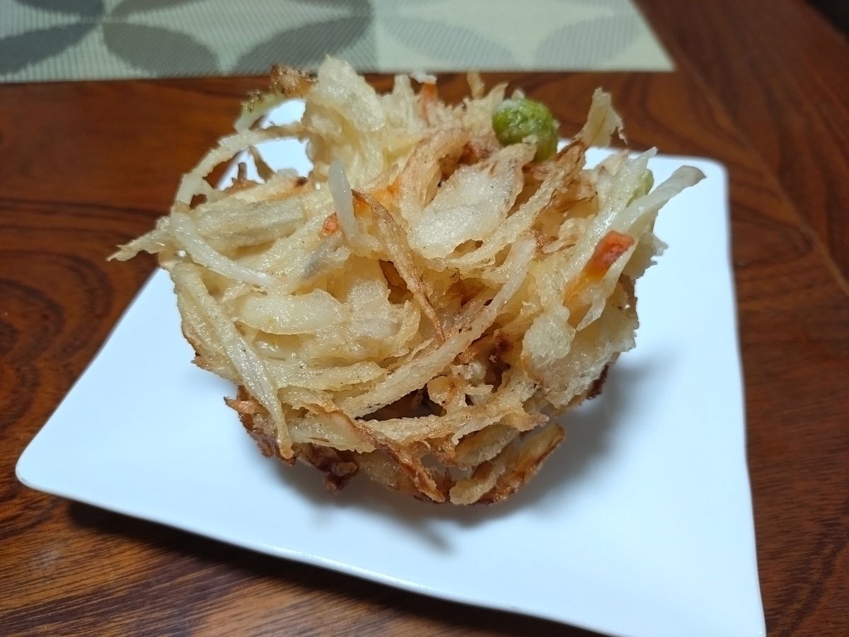 もちもち感を少し出すために片栗粉を増量。 衣の油を減らすために玉ねぎを大きめにカット。 サクサクしたいなら具材を細くカット、片栗粉カット。 油を減らしたいならば具材は大きくカット。 あとは好み。 味付けは衣に顆粒だし。 #かき揚げ #研究 pic.x.com/1Ynmgzi86o