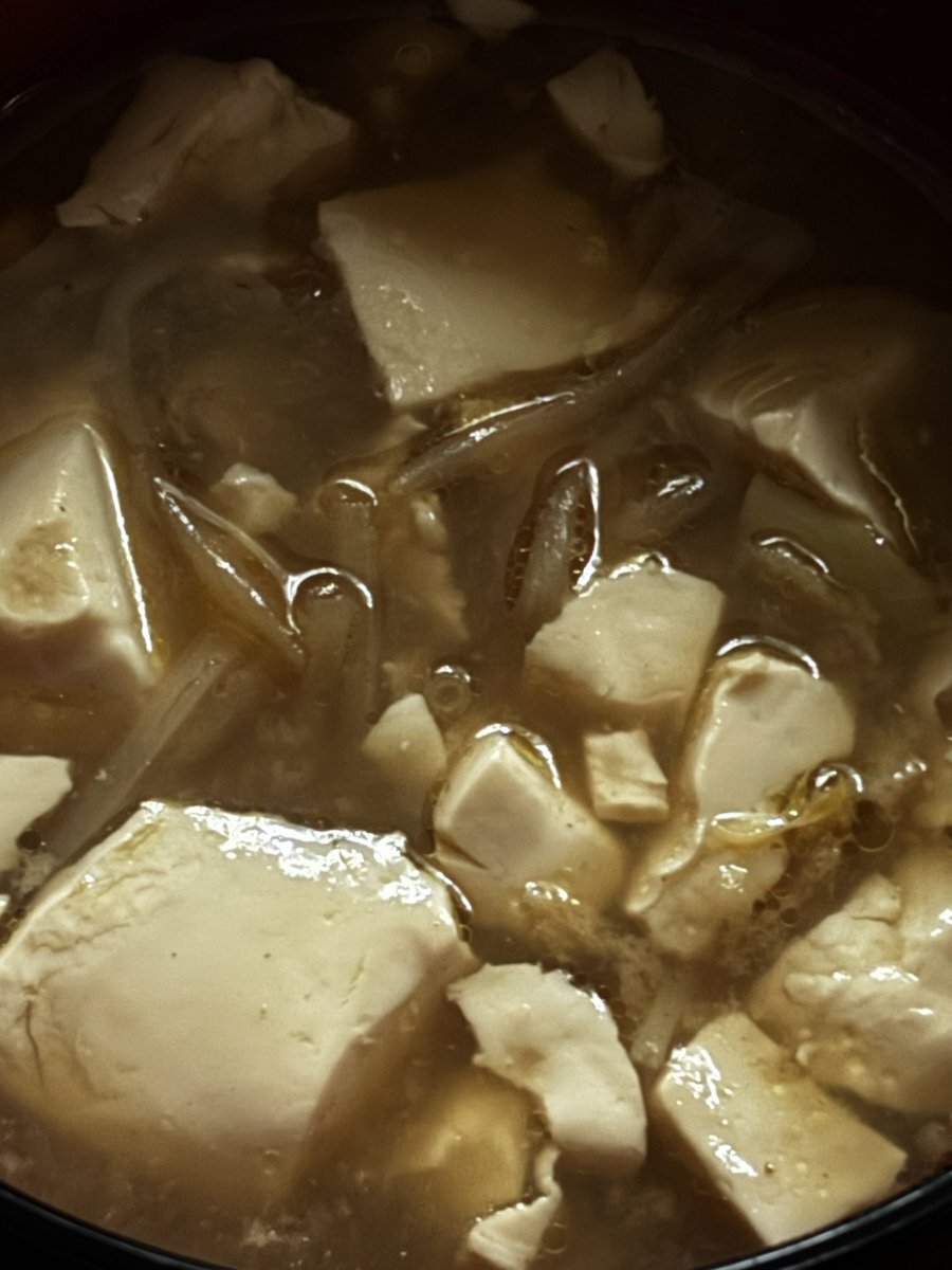 モヤシ余ってたから湯豆腐の味付けして、このタレ入れて豆腐と余ったかき揚げ入れて煮たのを食す #豆腐 #モヤシ #かき揚げ #背油 #二郎系 #料理好きと繋がりたい pic.x.com/N2ZuZAYKSx
