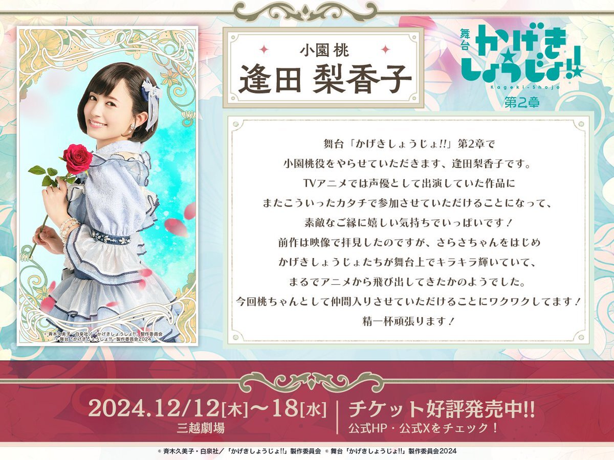 ⋰  舞台「#かげきしょうじょ!!」第2章🌹   🌟 12/12(木)~18(水)三越劇場🌟 ⋱ キャラ紹介⑦ 小園桃 #逢田梨香子 国民的アイドルJPX48のセンター。通称「小桃」。奈良田愛の元同僚で、野島聖の推し。 じつは、胸に熱い夢を秘めている。 💃チケット発売中🕺 w.pia.jp/t/kageki-stage/ #舞台かげき pic.x.com/CDbCS7pNta