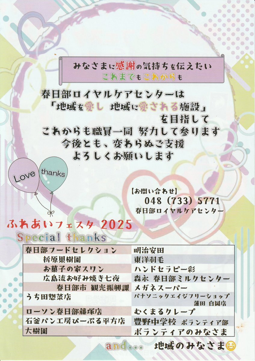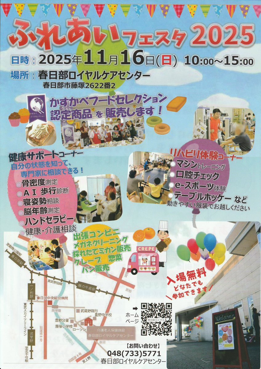 / 春日部ロイヤルケアセンター ふれあいフェスタ2025 が開催✨ \ 11月16日(日)10:00〜15:00 春日部ロイヤルケアセンター(藤塚2622-2)にて開催! #かすかべフードセレクション ブースの出店や健康サポートコーナーリハビリ体験コーナーなどを開催。 入場無料どなたでもご参加いただけます。 #春日部