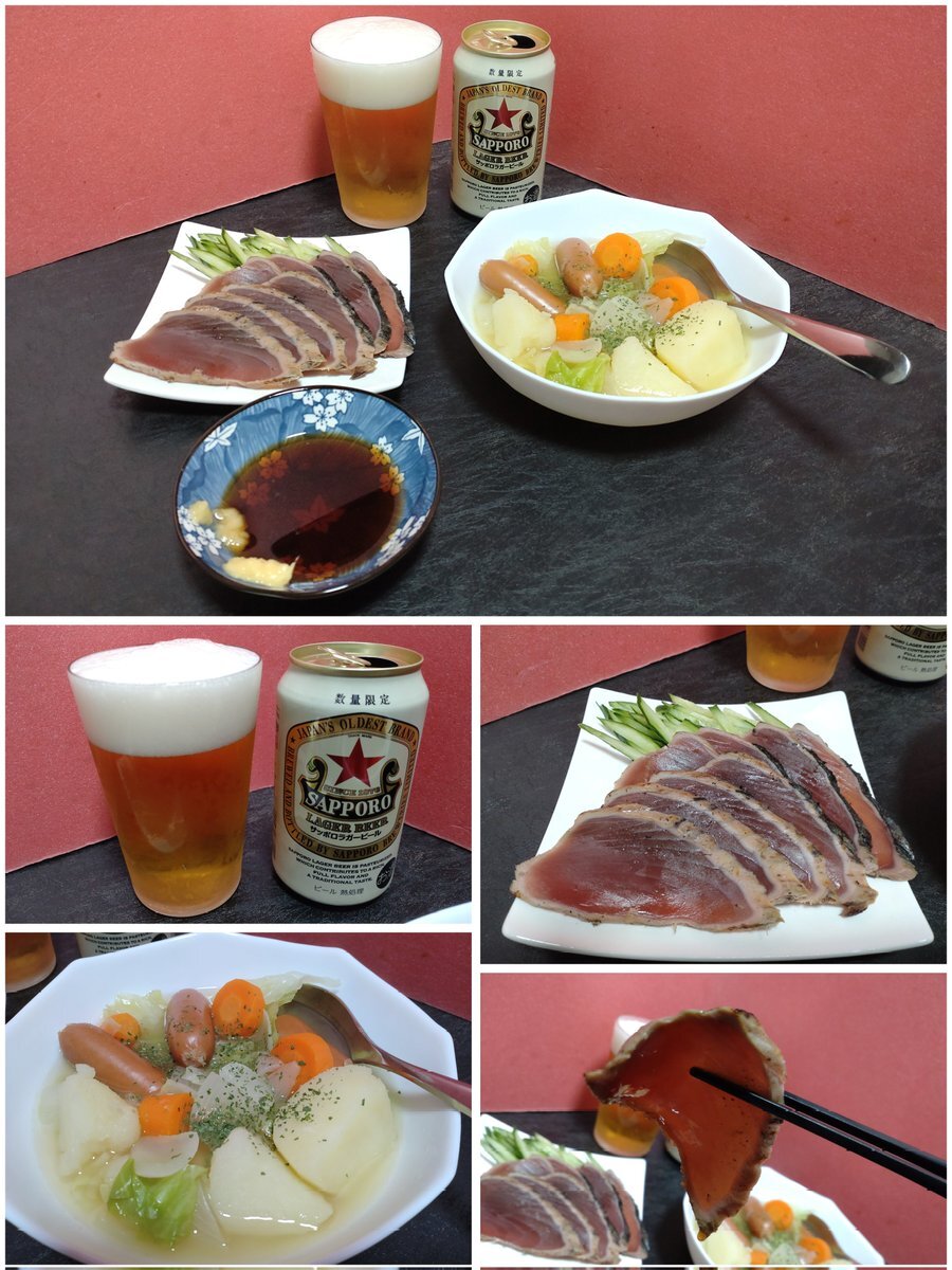 朝、寝起きに体温を計ったら 1回目36.0°C 2回目36.1°C 完全に平熱♨️ でも、まだ少し声枯れの一日でしたが、ほぼ快気と言ってよいのではないでしょうか〜?な、#晩餐 #かつおのたたき #ポトフ pic.x.com/k2ENhYGQv6