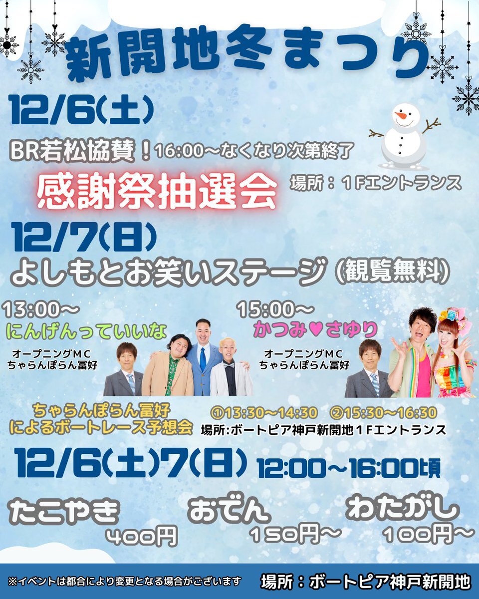 12/7(日)の新開地冬まつりでは、 ボートピア神戸新開地前特設ステージにて よしもとお笑いステージ&ボートレース予想会を開催いたします👏👏 是非皆様のご来場をお待ちしております🙂↕️ #新開地冬まつり #ちゃらんぽらん冨好 #にんげんっていいな #かつみさゆり pic.x.com/hwmyf3DGwP