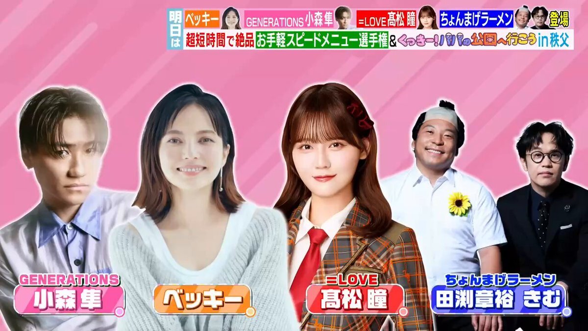 \📢明日のお知らせ🐰/ ⏰朝8時から2時間生放送☀️ お手軽スピードメニュー選手権🍳 くっきー!パパの 公園へ行こう🌳in秩父 きつね/佐藤龍我(#ACEes ) ベッキー スタジオゲスト🍭 小森隼(#GENERATIONS ) 髙松瞳(#イコラブ ) ちょんまげラーメン ベッキー #ラヴィット