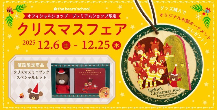 12/6(土)~12/25(木)#くまのがっこう オフィシャルショップ・プレミアムショップにてクリスマスフェアを開催🎄✨フェア期間中、グッズを税込2,200円以上お買い上げで「オリジナル木製オーナメント」をプレゼント🎁対象店舗などの詳細は公式HPにてご確認いただけます♪ #ジャッキーズマルシェ pic.x.com/ubKiUDMgoG