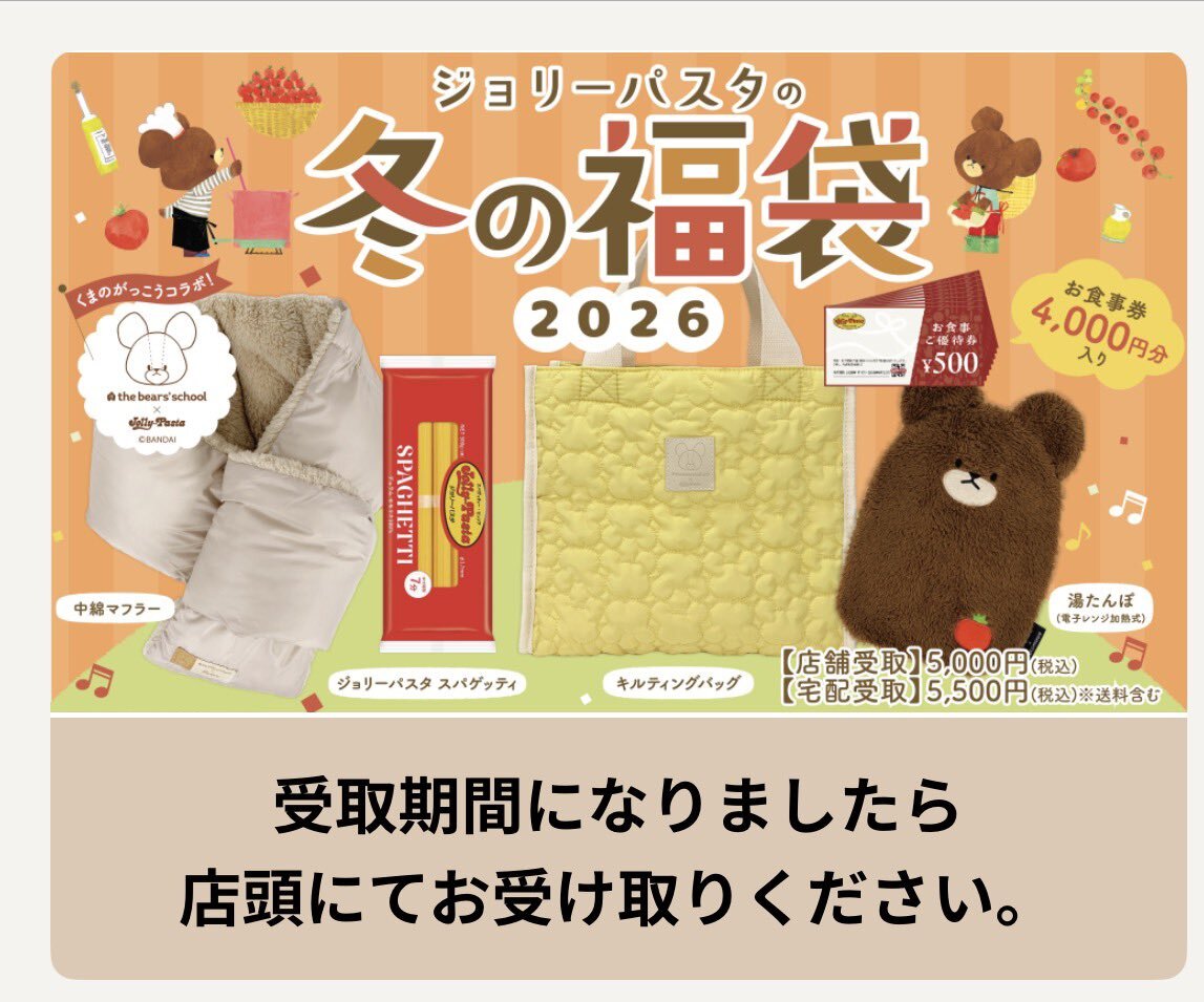 ジョリーパスタ「くまのがっこう」とコラボした「ジョリーパスタの冬の福袋2026」の抽選受付開始 gourmet.watch.impress.co.jp/docs/news/2062… #ジョリーパスタ #福袋 #くまのがっこう #ジャッキー pic.x.com/qtxkMuYEkl