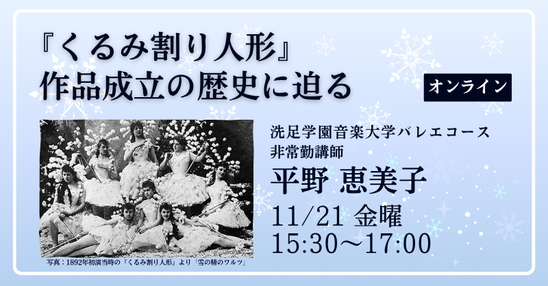 ❄️『くるみ割り人形』 作品成立の歴史に迫る❄️ 🗓11/21(金)15:30~17:00 👤平野恵美子さん@emiko_hirano/洗足学園音楽大学バレエコース非常勤講師、大阪大学招へい研究員 asahiculture.com/asahiculture/a… 華やかな冬の風物詩『#くるみ割り人形』。 pic.x.com/cSj5eBbxqH