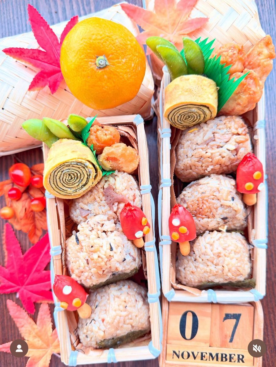 炊き込みご飯おにぎり弁当🍁 くるくる卵焼きにウインナーきのこ🍄も かわいいですね♪ 素敵な秋弁当 すごく美味しそうです😋 ごはんには、#こっそり雑穀 をご利用頂きました‼︎ 炊き込みご飯にもぴったりですよー📣 pic.x.com/NNQJNZOt2f