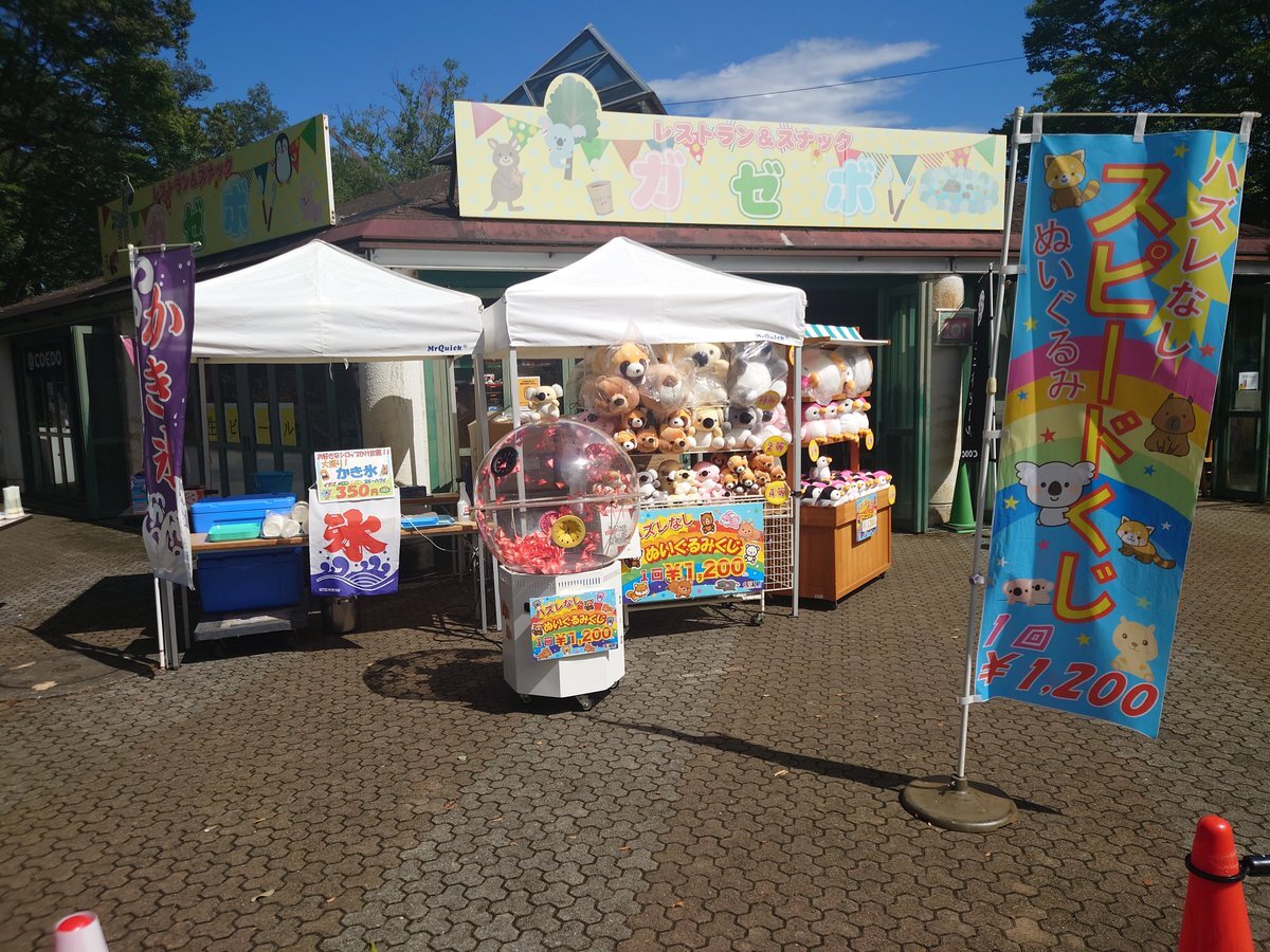 本日9月21日(日)晴!スピードくじは1回1200円はずれ無し!ぬいぐるみが当たる!以前人気ですぐになくなったペンギンが再登場! シロップかけ放題のかき氷350円!今日もナイトズーなので朝から生ビール、缶ビール販売中! #こども動物自然公園レストラン #こども動物自然公園 #ガゼボ #スピードくじ pic.x.com/iA9DjO1SIM