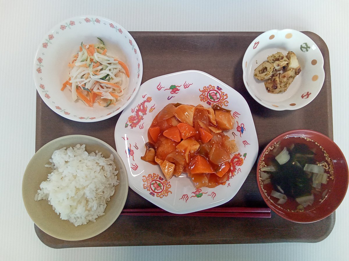 🍴今日の給食🍴 麦ごはん 酢鶏 大根サラダ 焼きちくわ わかめスープ #きゅうしょくだより #給食 #いただきます #ごちそうさまでした #城陽 #城陽作業所 pic.x.com/b7rVK21BYm