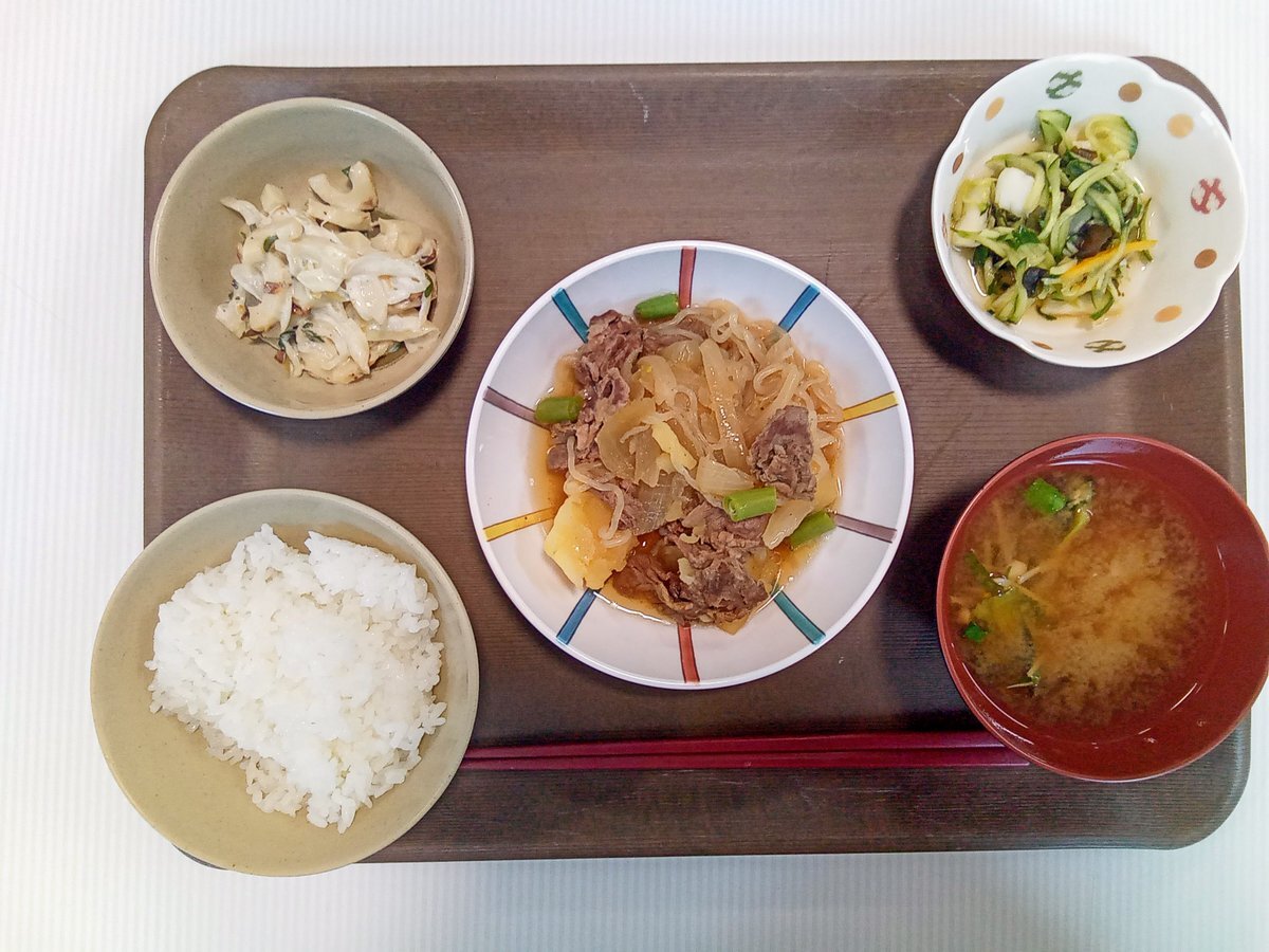 🍴今日の給食🍴 ごはん 肉じゃが イカの酢の物 玉ねぎの醤油マヨサラダ #きゅうしょくだより #給食 #いただきます #ごちそうさまでした #城陽 #城陽作業所 pic.x.com/7J2GaqV3Lw