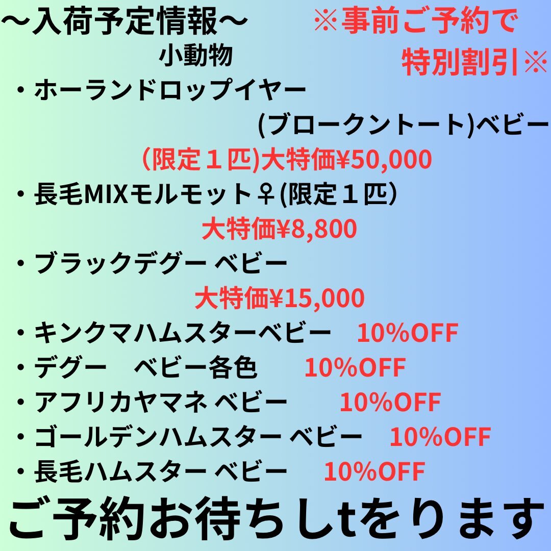 小動物入荷沢山ございます!! 長毛MIXモルモットさんは11月20日までのご予約で大特価になります。 お探しの小動物さんおりましたらお気軽にお問い合わせください‼️ #小どうぶつの森ホーさんの家 #小動物入荷情報 #ご予約受付中 #青森市 #ハムスター #モルモット pic.x.com/Nbrx7K7yKI