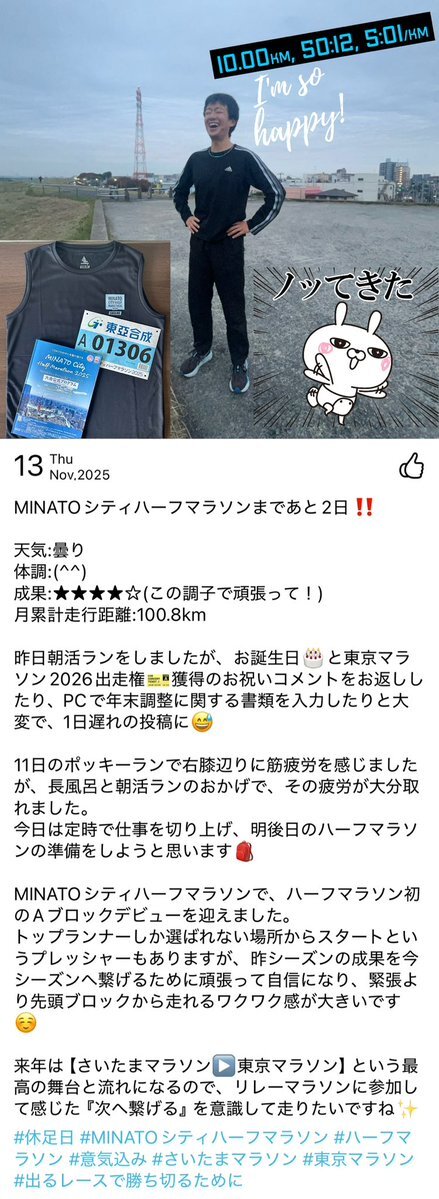 今日のラン結果です。 東京マラソン2026に参加できるようになったので、ご報告です。 2026年 2月→さいたまマラソン 3月→東京マラソン #東京マラソン #さいたまマラソン #越谷市 pic.x.com/zSRGHeOup9