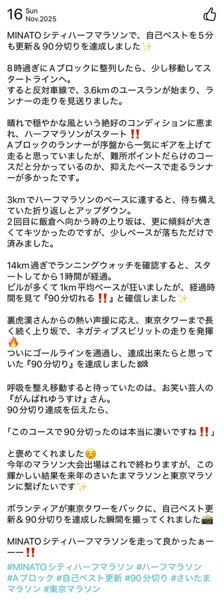 90分切りと自己ベスト更新を達成しました✨ 今年のマラソン大会出場はこれで終わりますが、この輝かしい結果を来年のさいたまマラソンと東京マラソンに繋げたいです✨ #ランニング #ランニング好きな人と繋がりたい #MINATOシティハーフマラソン #さいたまマラソン #東京マラソン #ラントリップ pic.x.com/rR1rPyLLWx