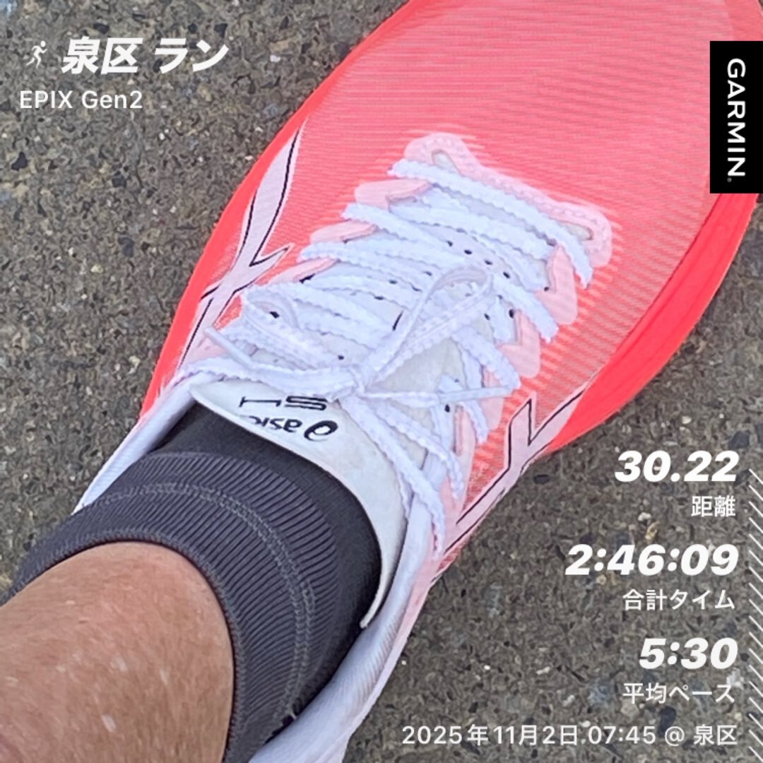 今日のランニング🏃 横浜マラソン挟んでの6週連続の30km走 とうとう5:30/km 今日S4 これは横浜マラソン効果か さて帰ってワールシリーズ7戦観よっと 月間走行距離50Kmで サブリノを目指す軟弱オッサンランナー #湘南国際マラソン #さいたまマラソン pic.x.com/bM5LQfMaqm