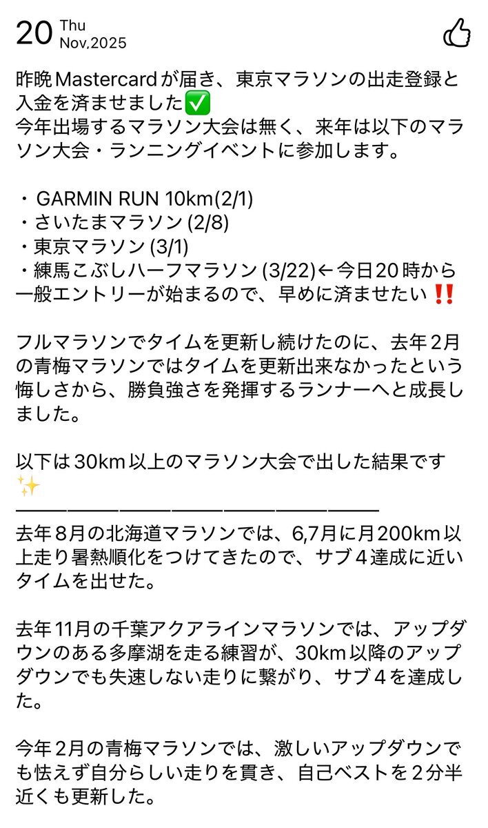 🟡練習がすべて🟡 25-26レース予定 1103 #ぐんまマラソン →PBも5時間切りならず 1116 #ひたちシーサイドマラソン 0110 #ニューイヤーマラソン ハーフ 0207 #さいたまマラソン 0215 #青梅マラソン 30k 0315 #板橋cityマラソン 🆕入金完了 楽しみます😊