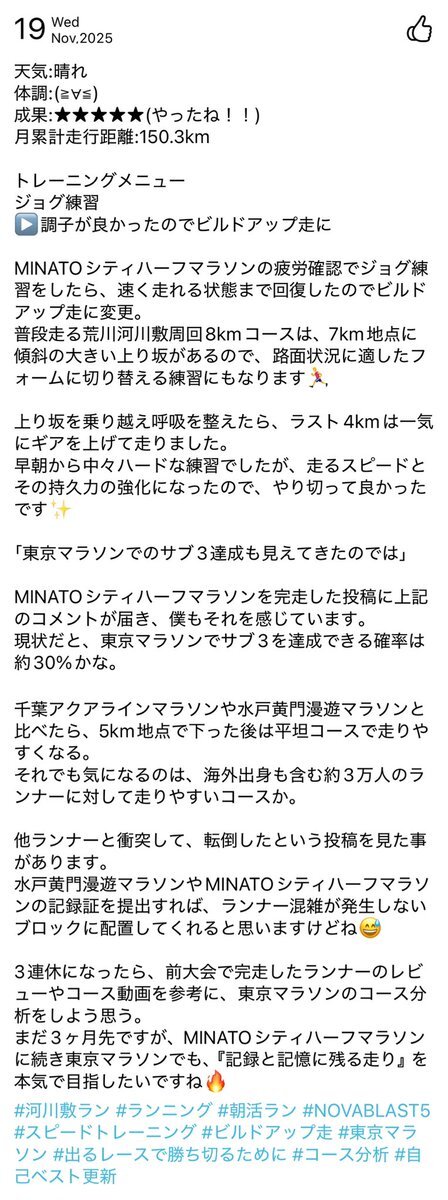 今日(11/12)は5キロペース走しました😊 上尾シティハーフマラソン4日前ですが なかなか調子が上がってきた⬆️ #フルマラソン #ランナー #ランニング #ハーフマラソン #上尾シティハーフマラソン #さいたまマラソン pic.x.com/B5yrdudDJ2
