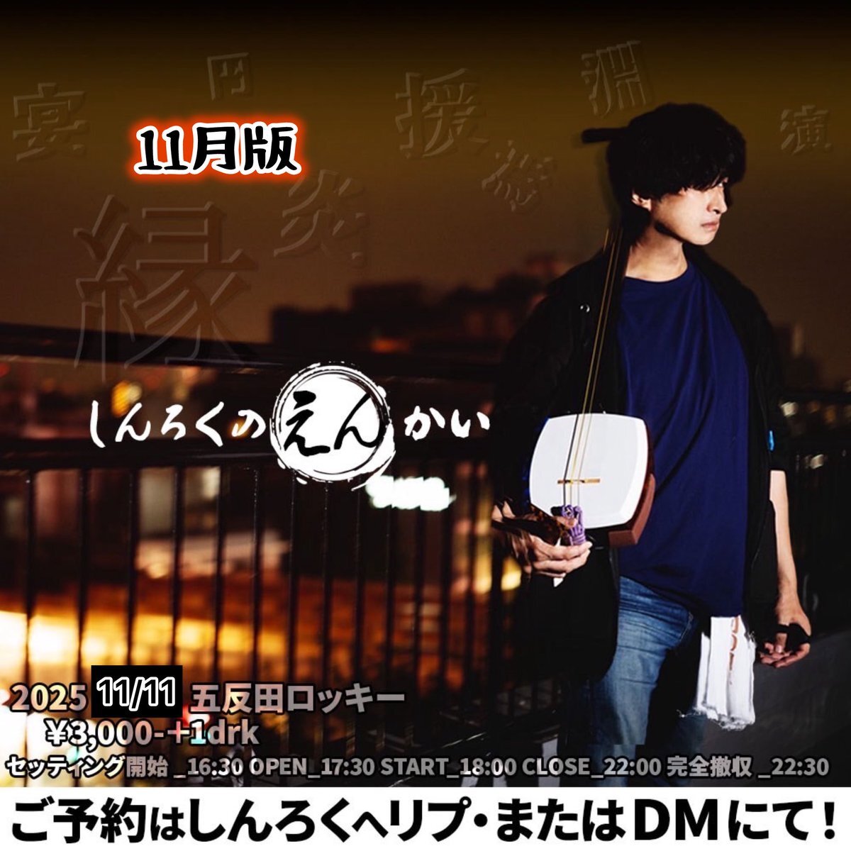 ジャンル不問の即興セッションと 異業種交流会 宴 演 縁 援 炎 焉 円 苑  色んな「えん」を集める しんろくのえん会 11月版です。 【日時】 11/11 16:30セッティング開始 open17:30〜 start 18:00〜 close 〜22:00 【参加費】 3000+1drk 【場所】 五反田ロッキー 【やること】