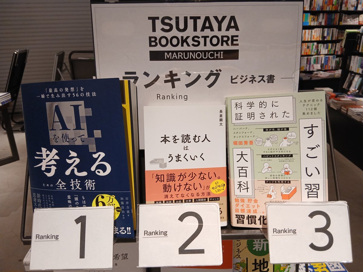 《丸の内店ビジネス・経済書週間ベストセラー》 9日ー15日集計ランキングベス卜6 ①AI を使って考えるための全技術 (#ダイヤモンド社) ②本を読む人はうまくいく  (#すばる舎 )  ③科学的に証明されたすごい習慣大百科  (#SBクリエイティブ) pic.x.com/xgSwyCFfr0
