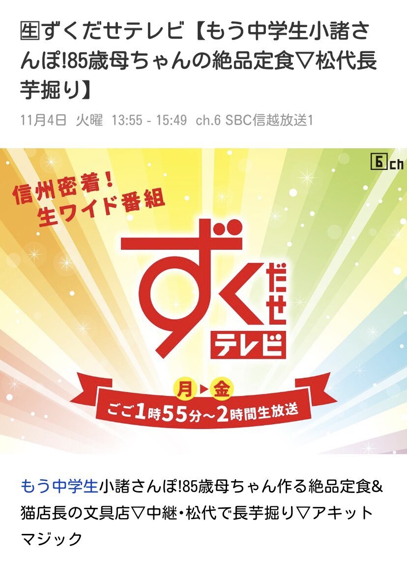 今日13:55〜 SBC「ずくだせテレビ」で、もう中学生の小諸さんぽが放映されるよ♪ 文具店のあの猫店長も出るので、お楽しみに! #小諸 #小諸市 #ずくだせテレビ #もう中学生 pic.x.com/EBMfpTBvsU
