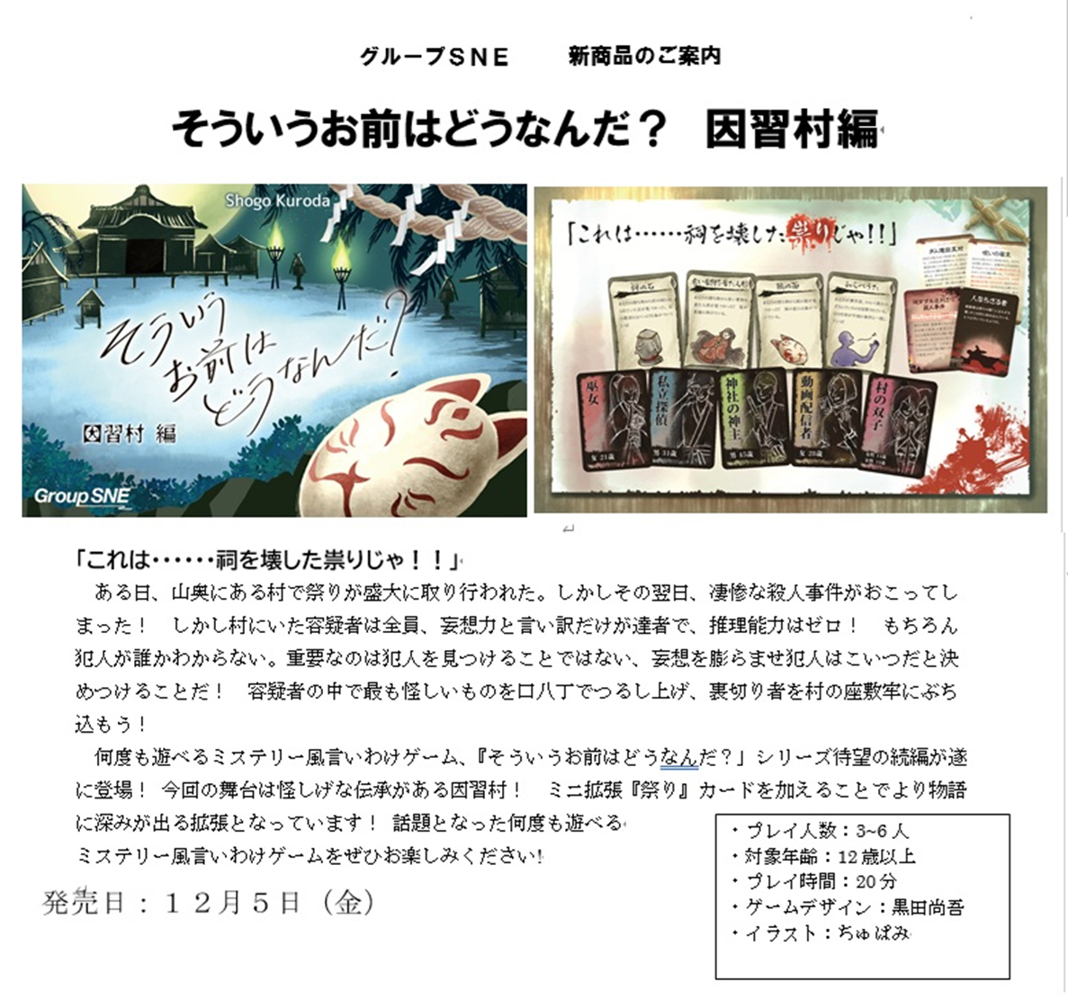 【予約情報】 #グループSNE より #ボードゲーム#そういうお前はどうなんだ ?因習村編』が 12月5日 発売決定! 「これは・・・祠を壊した祟りじゃ!!」 ミステリー風言いわけゲーム! #テーブルゲーム のご予約は簡単便利な #プロジェクトコア で! projectcore.jp/product-list/1… #ボドゲ pic.x.com/kqngHR5Dfu