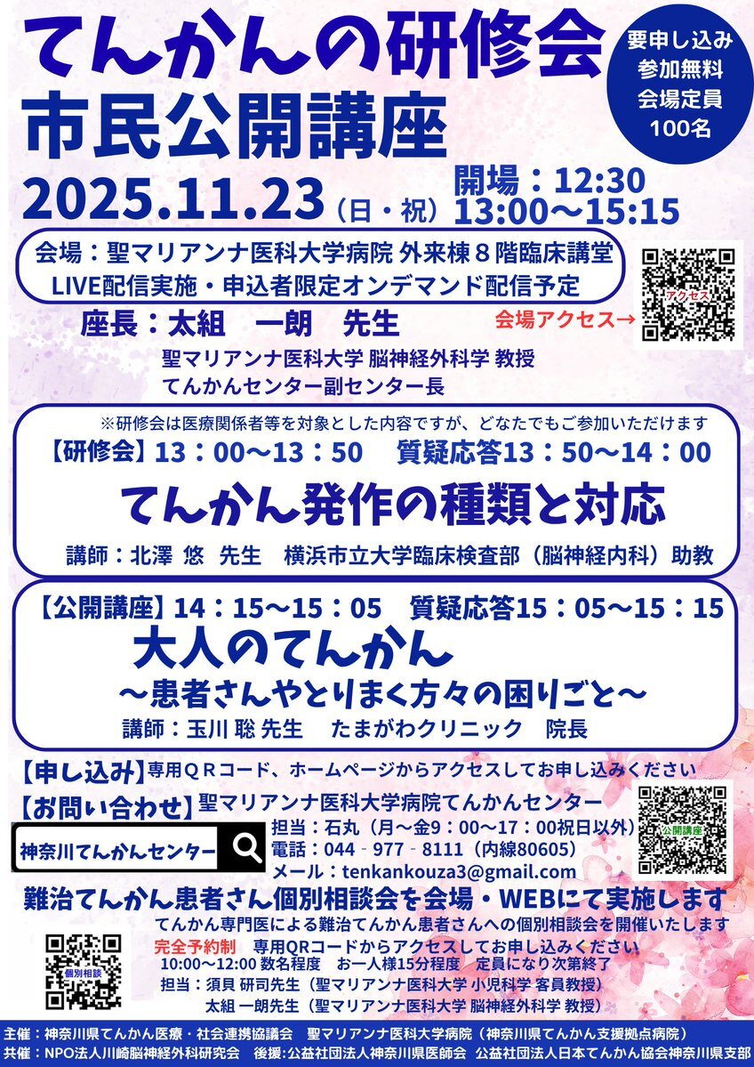 11月23日「てんかんの研修会・市民公開講座」の日、難治てんかん患者さんへの個別相談会も実施します! WEBでも対応しますので、ぜひお申し込みください! 難治てんかん個別相談申し込み forms.gle/SvC5awhSzFtwHA… 研修会・公開講座申し込み us02web.zoom.us/webinar/regist… #てんかん個別相談 #てんかん pic.x.com/HLgRtjDCGI
