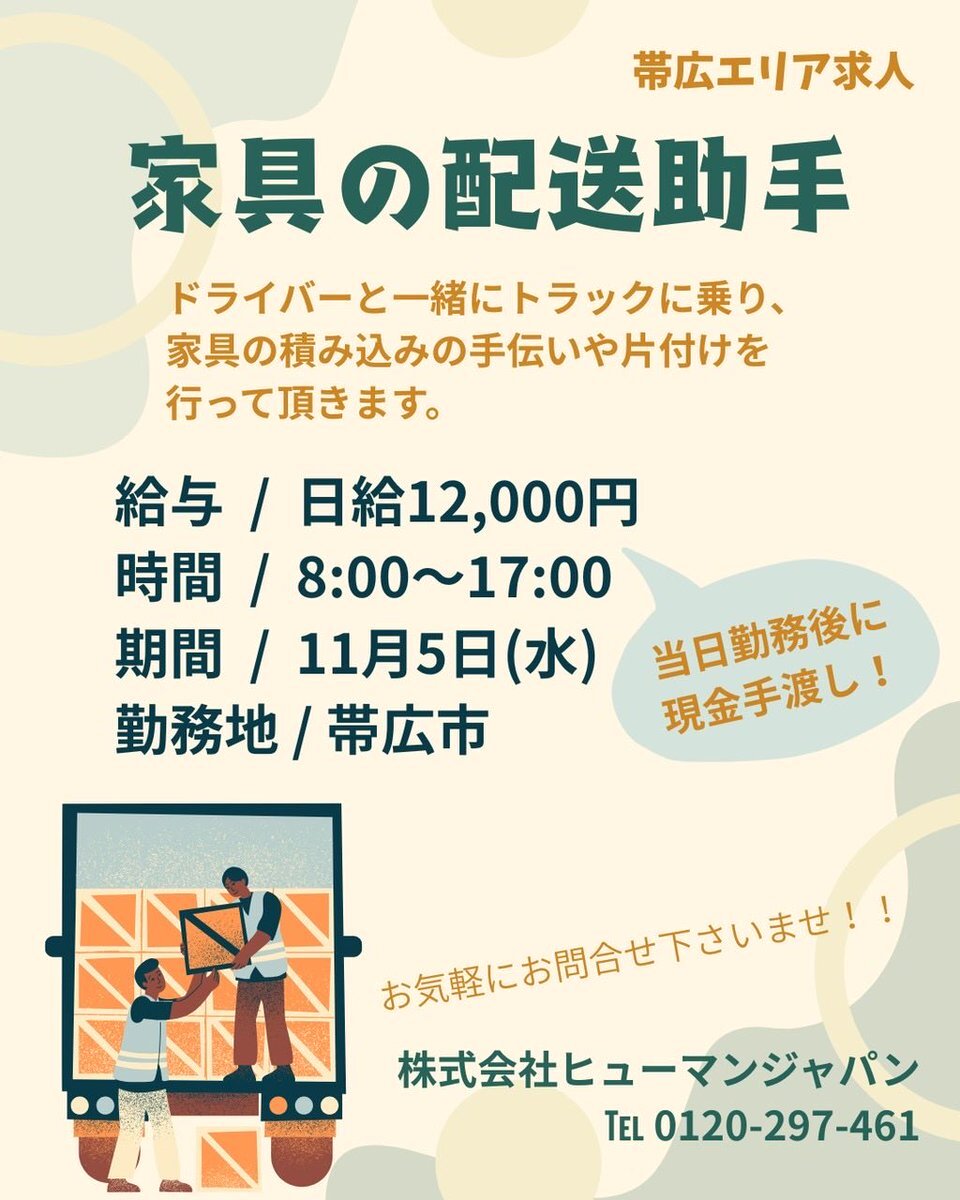 11月5日(水)のみ!! 家具の配送助手🚚 トラックにドライバーと一緒に乗ってもらって移動。一般家庭に家具の搬入出お手伝いや片付けなど! 8:00〜17:00 日当 12,000円 お仕事終わりに現金手渡し💸✨ 帯広市 #帯広畜産大学 #拡散希望 #お小遣い #帯広バイト #農家バイト