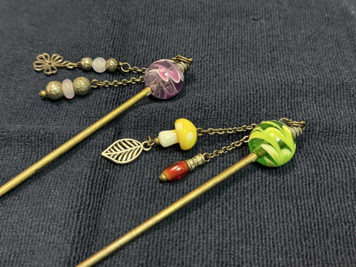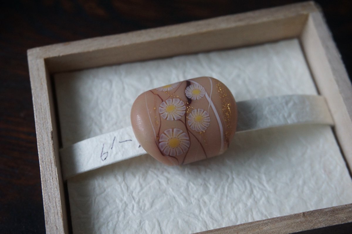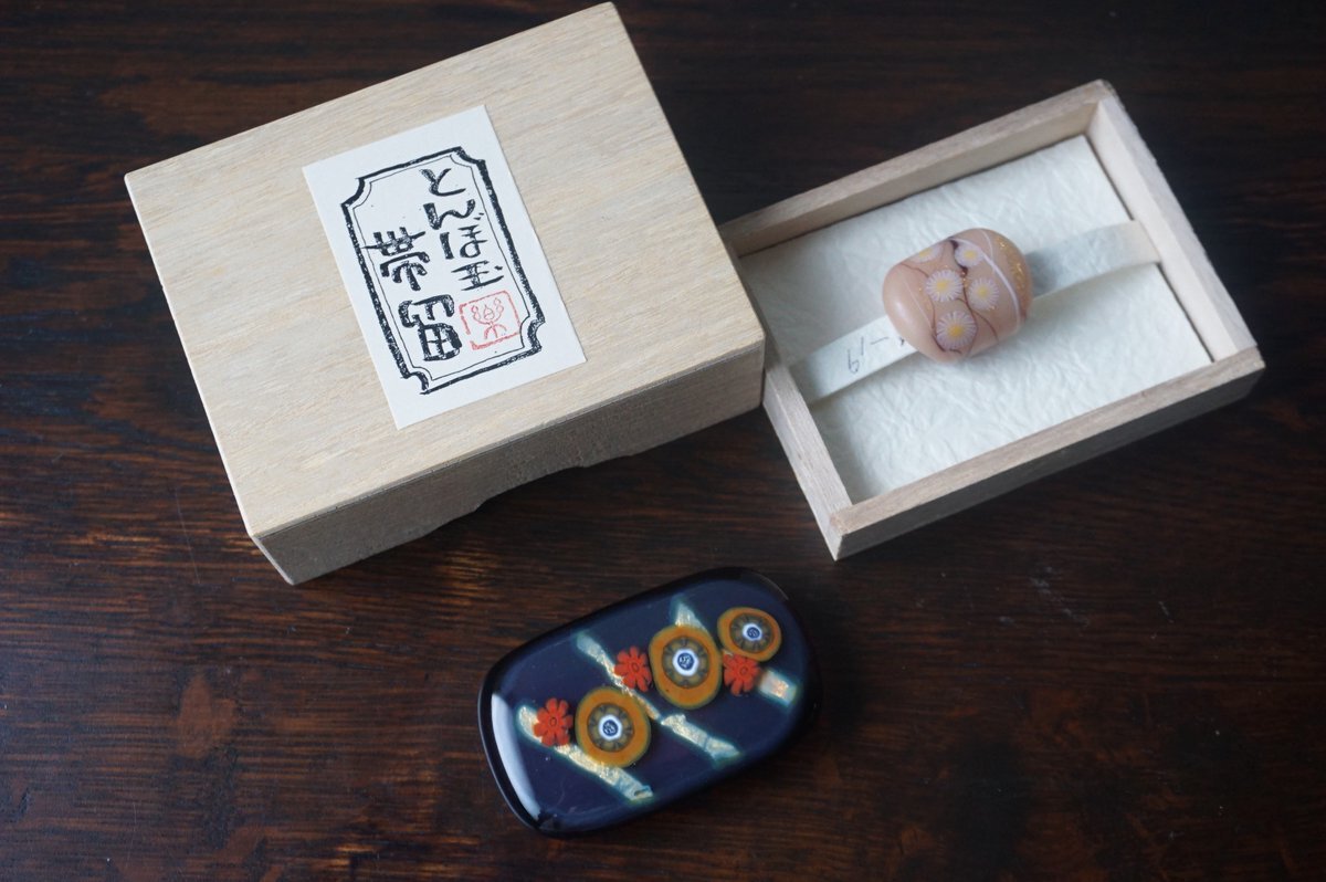 とんぼ玉の帯留、2点。 桜色のガラスに小花を封じたものと、紺地にモザイク模様を配したもの。いずれも手作業によるガラス細工で、透明層の奥に立体的な模様が見えます。晩夏から秋の装いに合わせやすい落ち着いた印象です。 #glassart #kimonoaccessory #帯留 #とんぼ玉 pic.x.com/KlD7lLm1XN