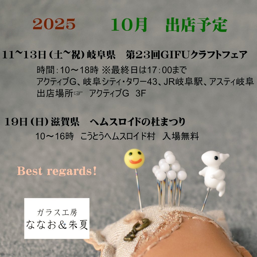 10月の出店予定です 11〜13日、GIFUクラフトフェア 19日、ヘムスロイドの杜まつり 共に初出店のイベントとなります 全てガラスの #ピアス、#ガラスアクセサリー、#とんぼ玉 など色々ありますのでどうぞ宜しくお願い致します ※本年度の関西での出店は、ヘムスロイドの杜まつりが最後となります pic.x.com/J1KFc5lBUc