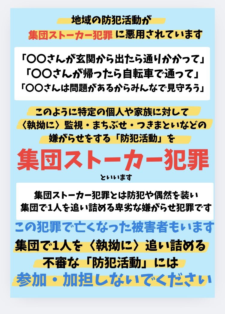 地域の #防犯活動 が #集団ストーカー犯罪 に悪用されています 〈特定の個人だけ〉を執拗に標的にした〈集団いじめのような防犯活動〉は #集団ストーカー犯罪 かも知れません 不審な防犯活動へは参加しないで下さい #防犯ボランティア #防犯パトロール #ながら防犯 #ながら見守り #防犯予算 pic.x.com/eEJOAf3LfR