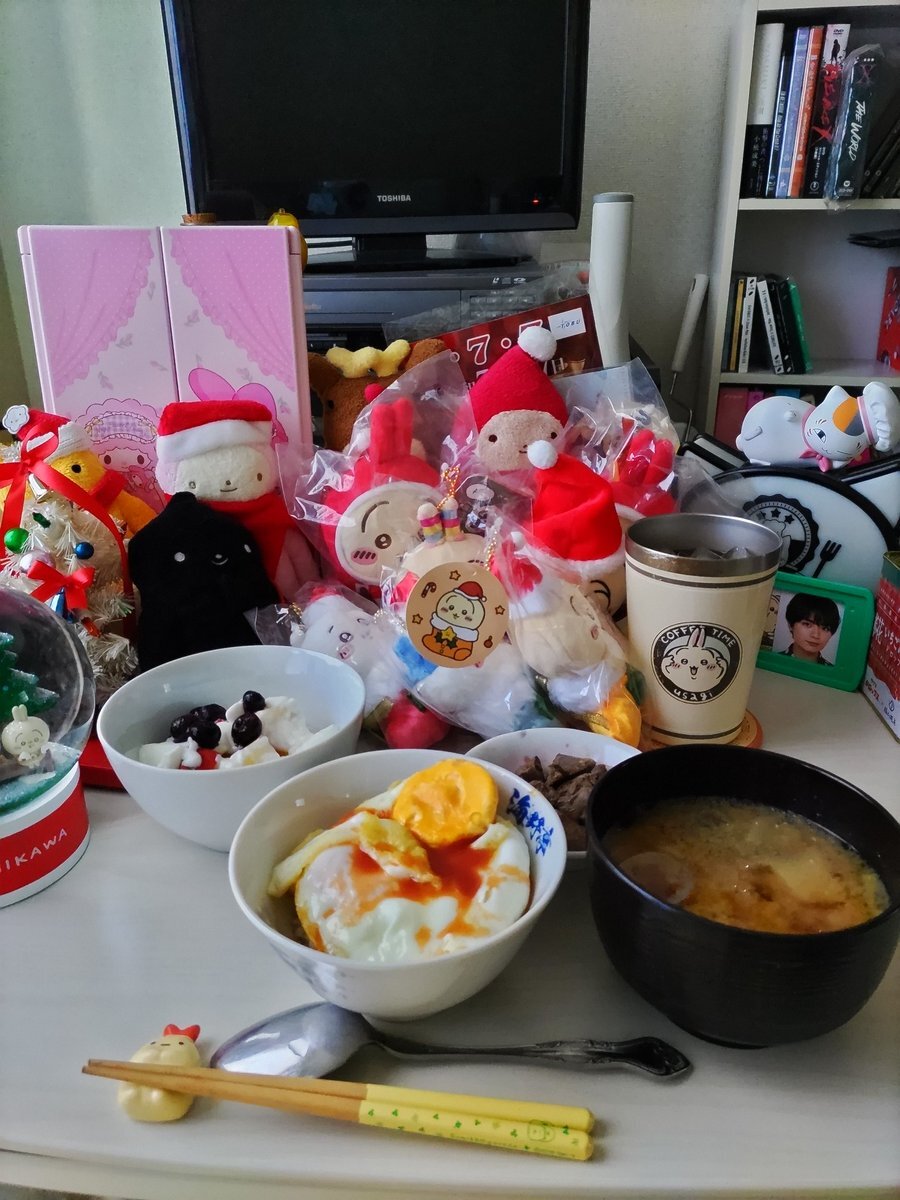 朝🌄ごはん🍚😉✨ 1個爆発して固くなった目玉焼き🍳2個もち麦ごはん丼 鶏レバー味ぽん煮 MCTオイル、すりごま、とろろ昆布入りさつまいも🍠とくず野菜の味噌汁 ブルーベリー、りんご、バナナとプレーン脂肪0ヨーグルト 麦茶 目玉焼き🍳丼には、カルディのオマール海老のタレかけた。 #ぬい撮り pic.x.com/9bbWIeH8G0