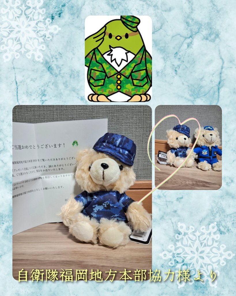 自衛隊福岡地方協力本部様(@fukuoka_PCO )より 海デジタル迷彩ベアボールチェーン を頂きました🏵️ テディベア&自衛隊大好きな息子は大喜び💕 元々うちにいたブルーインパルスの子と一緒に並べて大喜び😆 ありがとうございます!✨ #ねこの当選報告 pic.x.com/u94kE08qzg