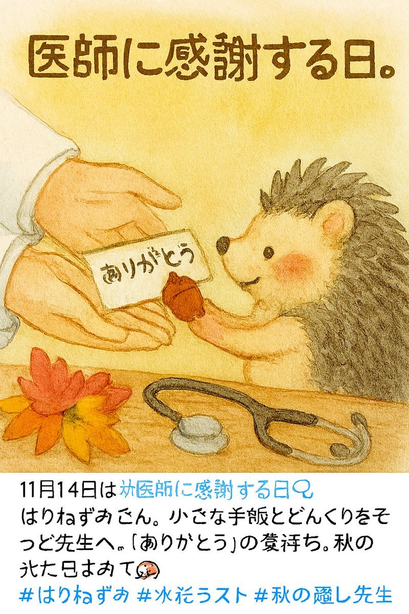 11月14日は #医師に感謝する日 🩺 ちいさなはりねずみさんが手紙とどんぐりをそっと先生へ。ありがとうの気持ちが秋の光に包まれる一瞬🦔🍂 いつも本当にありがとうございます。 #はりねずみ #水彩イラスト #ありがとう先生 pic.x.com/Bc2z8nyHme