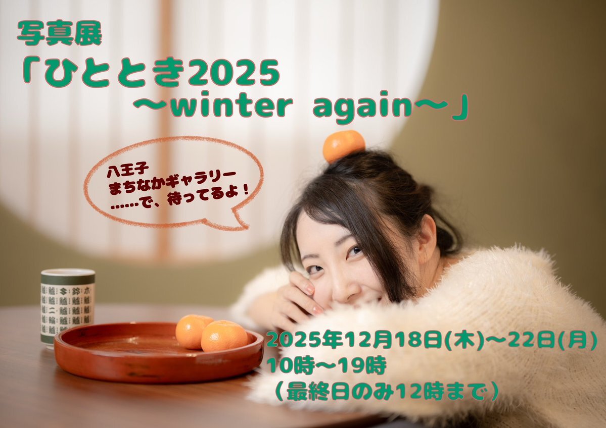 【写真展出展のお知らせ】 今年も八王子で写真展出展します! ご来廊お待ちしてます! 写真展「ひととき2025〜wnter again〜」 会場:八王子まち・なかギャラリーホール (東京都八王子市元本郷町3-24-1 2階) 日時:12/18(木)~22(月) 10時〜19時 (最終日のみ12時まで) よろしくお願いいたします