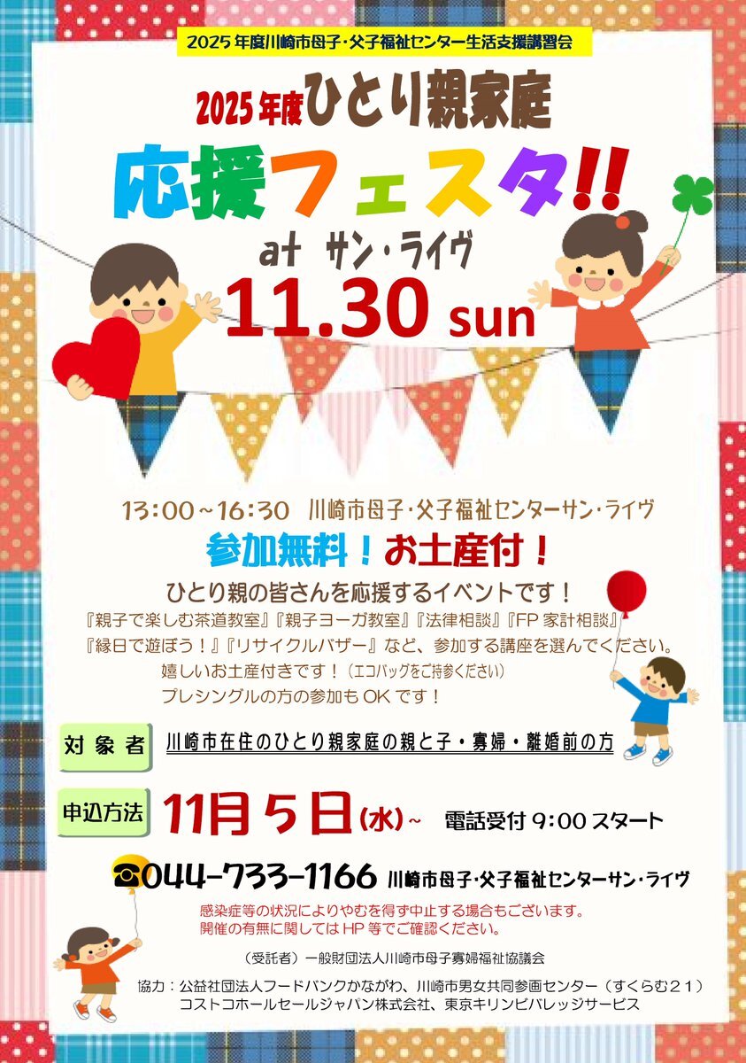 親子で体験できるイベント🧘や相談ごとなど #ひとり親家庭 の方を応援するイベントを #川崎市 母子・父子センターサン・ライヴで開催します👩👧🎉 \ 参加無料 / 🌈ひとり親家庭応援フェスタ!!🪇 11/30(日) 13:00~16:30 申込受付やイベントの詳細はこちら⬇️ kawasaki-boshicenter.com/seminar/#sem_10 pic.x.com/DklpCVyKnw
