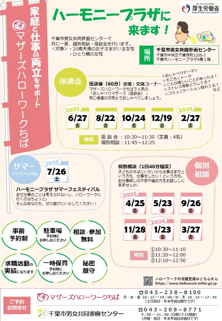 11/28(金)\家庭と仕事の両立をサポート/ #マザーズハローワークちば 出張〈個別相談〉開催! 対象:20歳未満のお子さまがいる女性、ひとり親の女性 ▽詳細・予約は下記まで マザーズハローワークちば☎043-238-8100 千葉市男女共同参画センター☎043-209-8771 #千葉市 #仕事 #ひとり親 pic.x.com/qyrCVldoWZ