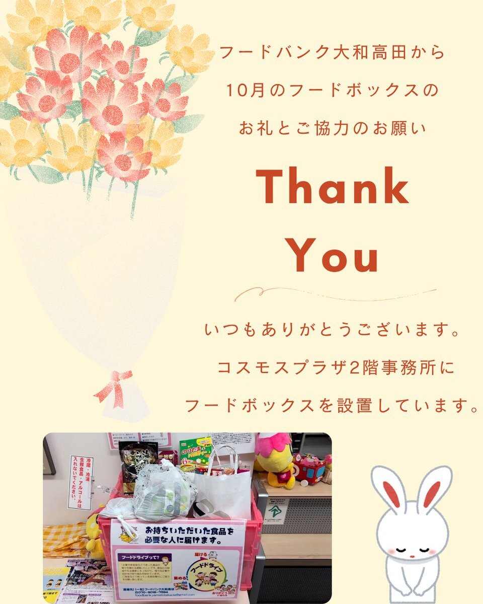 フードバンク大和高田からのお知らせ🌈 【10月のフードボックスお礼とご協力のお願い】 コスモスプラザ2階事務所にフードボックスを置かせていただいていますので食品寄付にご協力よろしくお願いいたします🙏 #フードバンク #フードバンク大和高田 #子ども食堂 #ひとり親 #フードボックス #子ども pic.x.com/GYY3WrnZez