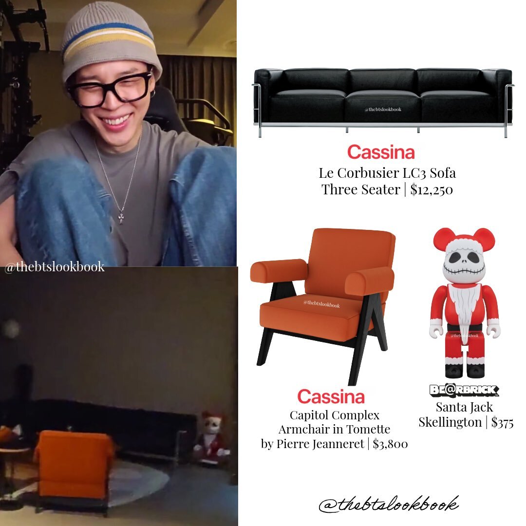 Jimin House Decor: - Cassina “Le Corbusier LC3 Sofa” - Cassina “Capitol Complex Armchair” - Drax “MM5050 Incline Trainer” - Xenics “Arena Zero Gaming Chair” #jimin #박지민 #BTS #thebtslookbook #jiminfashion #ootd #home #Cassina #Weverse_LIVE #HappyJiminDay