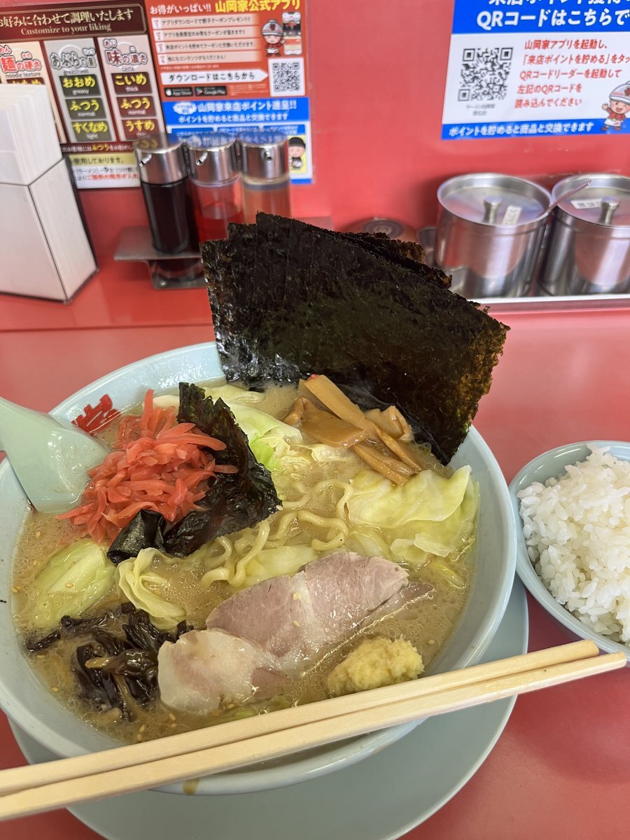 #ひるふふ #ふふふ 山岡家白味噌豚骨ラーメン かため、濃いめ、紅生姜、ノリ、 キャベツトッピング、半ライス もう、お腹いっぱいでふ、げふっ ご飯に何を乗せて海苔で巻いて 食べようか、むしろこっちが メーン説あるよ? 紅生姜、メンマ、キャベツを ご飯にオンしてニンニクと pic.x.com/6wwAgjOJXZ