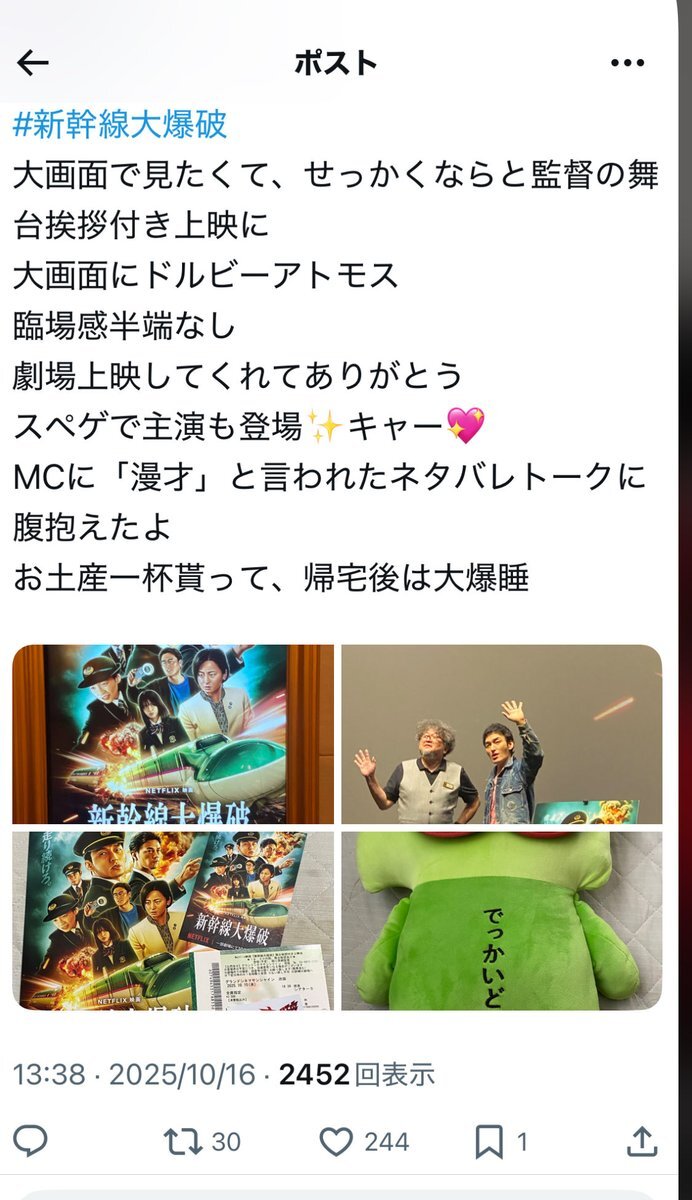 舞台付き挨拶のポストに❷❹❹いいね👍いただきました😆 この作品はやはり大画面に映える 行きたかったけど行けなかった方が沢山いたと思う 是非多くの地方で公開していただきたいと思う次第です #新幹線大爆破 #Netflix #ぷっくりニュース pic.x.com/WMTyUx8kLn